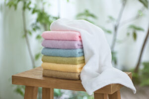 その昔、前会長の子供がアトピーを発症し、その原因について考えていた時のこと、子供がタオルを咥えているうちに染まっていた色が薄くなっていることに気がつきました。「もしかすると、自分たちが作っているタオルが、知らぬ間に化学薬品を取り込む経路になっていて、体に悪影響を与えているかもしれない」と、自分達の仕事を一から見つめ直したことがきっかけで、製造工程の改善を始め、化学薬品の使用を最大限抑え、素材にもオーガニックを使用し、使いやすく寄り添ったタオルとして開発しました。※上記の製法は2004年に特許を取得しましたが、たくさんの方に使用してほしいという思いから現在は特許を放棄しています。